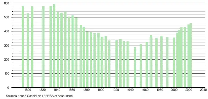 L'évolution du nombre d'habitants est connue à travers les recensements de la population effectués dans la commune depuis 1793. Pour les communes de moins de 10 000 habitants, une enquête de recensement portant sur toute la population est réalisée tous les cinq ans, les populations de référence des années intermédiaires étant quant à elles estimées par interpolation ou extrapolation[30]. Pour la commune, le premier recensement exhaustif entrant dans le cadre du nouveau dispositif a été réalisé en 2004[31].