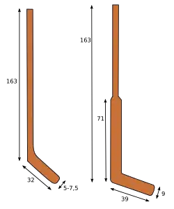La crosse du gardien est plus coudée et la palette plus large (dessin de droite).