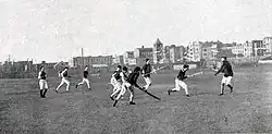 Ce jeu traditionnel était un des évènements phares à cette époque et pouvait se dérouler sur plusieurs jours durant lesquels des rencontres s'organisaient entre villages ou tribus voisins, réunissant à l'occasion des centaines voire un millier de participants. Il se disputait souvent sur un terrain entre les deux villages adverses et les buts pouvaient être distants de 500 mètres à plusieurs kilomètres[5]. Les règles de ces jeux étaient décidées quelques jours avant la compétition. Généralement, tout le monde pouvait y participer, la balle ne devait pas être touchée avec la main, les buts étaient constitués soit des rochers soit des arbres, avant la mise en place de poteaux en bois, et la durée du match dépendait du soleil. Chaque joueur était armé d'une crosse.