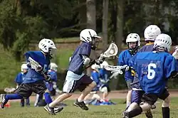 Un joueur de crosse poursuivi par son adversaire. | |