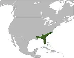 Cette espèce est endémique du sud-est des États-Unis. Elle se rencontre à l'est depuis la Caroline du Nord et le long de la péninsule de Floride jusqu'aux Keys au sud, en passant par la Floride, Caroline du Sud et la Géorgie, et jusqu'en Louisiane en passant par l'Alabama et le Mississippi à l'ouest[1],[7].