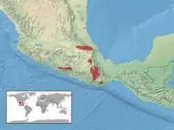 Cette espèce est endémique du Mexique. Elle se rencontre dans le centre-Ouest de l'État de Veracruz, dans le sud-ouest de l'État de Tlaxcala, dans l'État de Puebla, dans l'État de Guerrero, dans l'État d'Oaxaca et dans le sud-est de l'État d'Hidalgo[1].