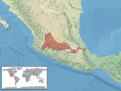 Cette espèce est endémique du centre du Mexique. Elle se rencontre entre 1 450 et 2 600 m d'altitude du sud de l'État de Zacatecas et du nord-est de l'État de Colima au centre-est de l'État de Veracruz et à l'État d'Aguascalientes[1].