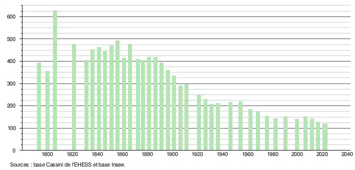 L'évolution du nombre d'habitants est connue à travers les recensements de la population effectués dans la commune depuis 1793. Pour les communes de moins de 10 000 habitants, une enquête de recensement portant sur toute la population est réalisée tous les cinq ans, les populations de référence des années intermédiaires étant quant à elles estimées par interpolation ou extrapolation[36]. Pour la commune, le premier recensement exhaustif entrant dans le cadre du nouveau dispositif a été réalisé en 2006[37].