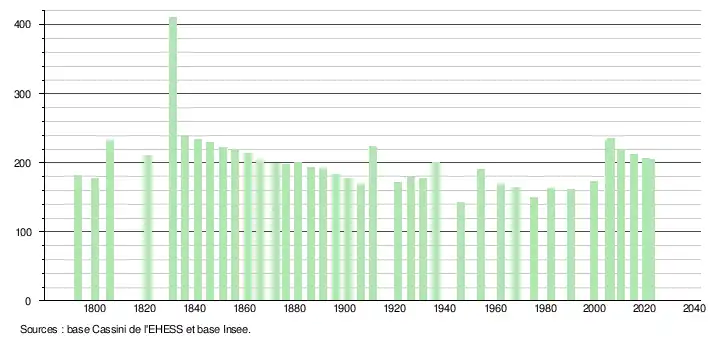L'évolution du nombre d'habitants est connue à travers les recensements de la population effectués dans la commune depuis 1793. Pour les communes de moins de 10 000 habitants, une enquête de recensement portant sur toute la population est réalisée tous les cinq ans, les populations de référence des années intermédiaires étant quant à elles estimées par interpolation ou extrapolation[24]. Pour la commune, le premier recensement exhaustif entrant dans le cadre du nouveau dispositif a été réalisé en 2005[25].