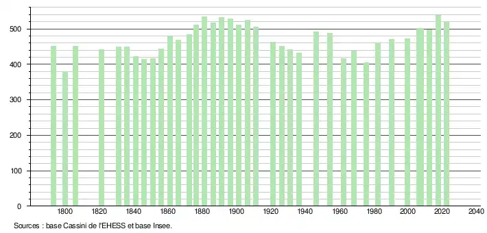 - ↑ Fiches Insee - Populations de référence de la commune pour les années 2006, 2007, 2008, 2009, 2010, 2011, 2012, 2013, 2014, 2015, 2016, 2017, 2018, 2019, 2020, 2021 et 2022.