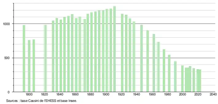 L'évolution du nombre d'habitants est connue à travers les recensements de la population effectués dans la commune depuis 1793. Pour les communes de moins de 10 000 habitants, une enquête de recensement portant sur toute la population est réalisée tous les cinq ans, les populations de référence des années intermédiaires étant quant à elles estimées par interpolation ou extrapolation[31]. Pour la commune, le premier recensement exhaustif entrant dans le cadre du nouveau dispositif a été réalisé en 2004[32].
