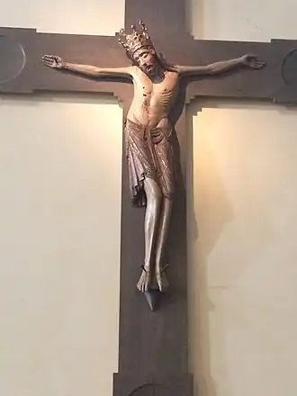 La chevelure de l'homme en croix est minuscule, très ténue, ainsi que les plis du pagne qui recouvre le sujet presque jusqu'aux genoux ; une couronne est posée sur la tête de la statue. Que le crucifix fasse partie d'un groupe également composé de saint Jean et de la Vierge Marie n'est pas certain, mais c'était la composition habituelle de l'époque ; le crucifix était donc placé au centre, accroché à la cloison qui séparait la salle réservée aux fidèles du presbytère et du chœur. Aucune documentation n'est restée sur cette partie de l'ouvrage.