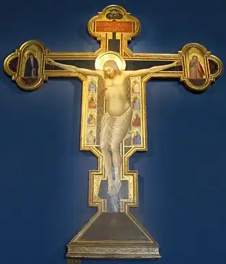 Le crucifix peint est conforme aux représentations monumentales du Christ en croix de l'époque post-giottesque, à savoir le Christ mort sur la croix en position dolens (souffrant) :