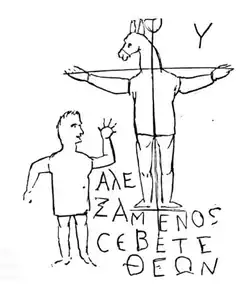Le graffito d'Alexamenos qui pourrait être la plus ancienne représentation de la crucifixion de Jésus dessinée entre le Ier siècle et le IIIe siècle (figure de gauche), évoque déjà le cloutage (dessin de droite). | ||