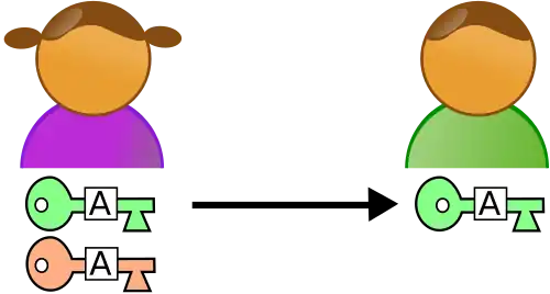 L'authentification ou la signature : Alice place un message dans le coffre-fort qu'elle ferme avec sa clé privée avant de l'envoyer à Bob. Si Bob parvient à ouvrir le coffre à l'aide de la clé publique d'Alice (dont il dispose), c'est que c'est bien le coffre fermé par Alice puisque la clé de Bob ne permet d'ouvrir que les coffres fermés par Alice. Bob est donc certain que c'est bien Alice qui y a placé le message.