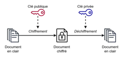 La cryptographie asymétrique peut être illustrée avec l'exemple du chiffrement à clé publique et privée, dont le but, comme tout chiffrement, est de garantir la confidentialité d'une donnée lors d'une transmission de celle-ci. Le terme asymétrique s'explique par le fait qu'il utilise deux clés différentes, l'une, la clé publique, pour chiffrer, l'autre, la clé privée, pour déchiffrer. L'utilisateur qui souhaite recevoir des messages engendre un tel couple de clés. Il ne transmet à personne la clé privée alors que la clé publique est transmissible sans restriction[2]. Quiconque souhaite lui envoyer un message confidentiel utilise la clé publique pour chiffrer celui-ci. Le message chiffré obtenu ne peut être déchiffré que connaissant la clé privée. Il peut donc être communiqué publiquement : la confidentialité du message original est garantie. Le destinataire, qui n'a communiqué à personne sa clé privée, est le seul à pouvoir, à l'aide de celle-ci, déchiffrer le message transmis pour reconstituer le message original[1].