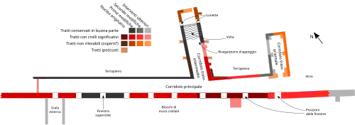 Cette pièce principale, même si elle devait ressembler à la manière dont Meomartini la décrivait déjà au XVIIIe siècle, était un vestige d'une galerie beaucoup plus longue. Des constructions se poursuivant sur la même ligne (encore partiellement visibles) ont été identifiées par l'architecte aux deux extrémités ; au total, avec le couloir restant, ils couvraient 546 m. Si l'on ajoute à cela un environnement voûté couvert observé dans les années 1980 sous une maison de la Via Luca Mazzella dans le centre historique, on peut émettre l'hypothèse que le complexe mesurait plus de 600 m de longueur.
