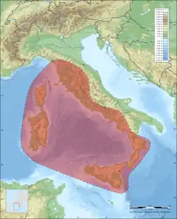 Cette espèce se rencontre en Corse[2],[3],[4],[5],[6] y compris dans les Îles Lavezzi[7] et en Italie en Sardaigne[2],[3],[4],[5],[6],[8] y compris sur l'île la Vacca[9], en Sicile[5], dans les îles Pontines[4], dans l'archipel toscan[5] et sur la côte tyrrhénienne de l'Italie continentale[3],[5] en Toscane[10], en Campanie[10] et en Calabre[11].
