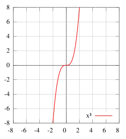 La fonction cube désigne celle qui, à un nombre réel donné associe son cube. Cette fonction est impaire, c'est-à-dire que les images d'une valeur et de son opposé sont encore opposées. Les cubes de 4 et de -4 sont respectivement égaux à 64 et -64. Le cube d'un nombre réel positif (resp. négatif) est un nombre positif (resp. négatif) et, comme les nombres entiers ou rationnels sont aussi des nombres réels, cette propriété est encore vérifiée.
