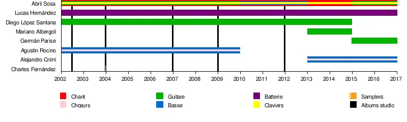 - Abril Sosa - chant (depuis 2002), claviers (depuis 2002), guitare (2002-2010, depuis 2015), basse (2010-2013)