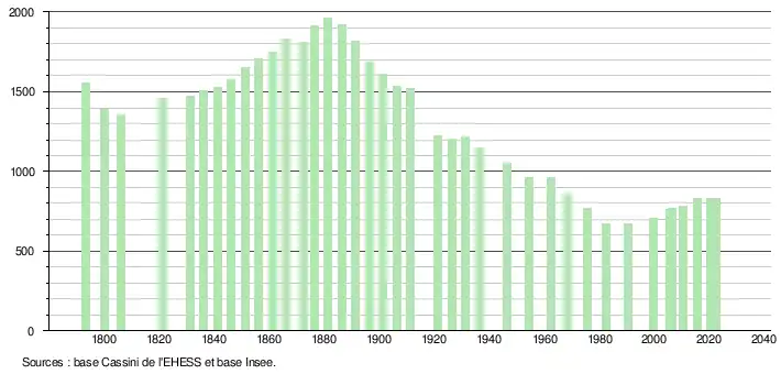L'évolution du nombre d'habitants est connue à travers les recensements de la population effectués dans la commune depuis 1793. Pour les communes de moins de 10 000 habitants, une enquête de recensement portant sur toute la population est réalisée tous les cinq ans, les populations de référence des années intermédiaires étant quant à elles estimées par interpolation ou extrapolation[31]. Pour la commune, le premier recensement exhaustif entrant dans le cadre du nouveau dispositif a été réalisé en 2005[32].