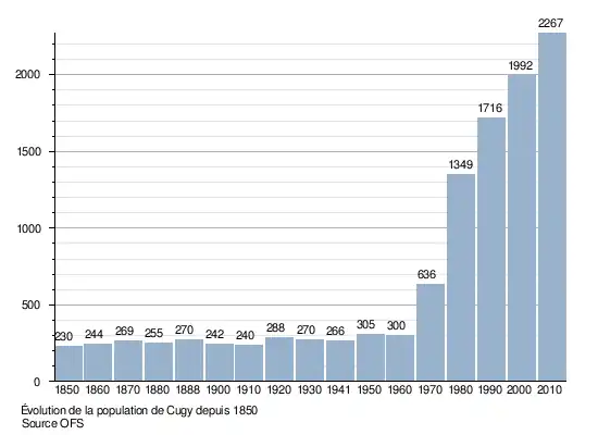 La population de Cugy est de 230 habitants en 1850, puis de 300 habitants en 1960. Le nombre d'habitants augmente ensuite très fortement, puisqu'il est multiplié par 7,5 en 50 ans, pour atteindre 2 267 habitants en 2010. Le graphique suivant résume l'évolution de la population de Cugy entre 1850 et 2010[10] :