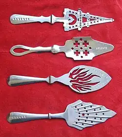 - Cuillère à absinthe : sans volume proprement dit car son cuilleron plat est percé, de forme grossièrement triangulaire, inventée au milieu du XIXe siècle. On pose le cuilleron sur les bords du verre, on y dépose du sucre en morceau, qui fond sous l'action de l'eau que l'on verse très lentement dessus et qui tombe dans le verre où ont été préalablement versés quelques centilitres d'absinthe.