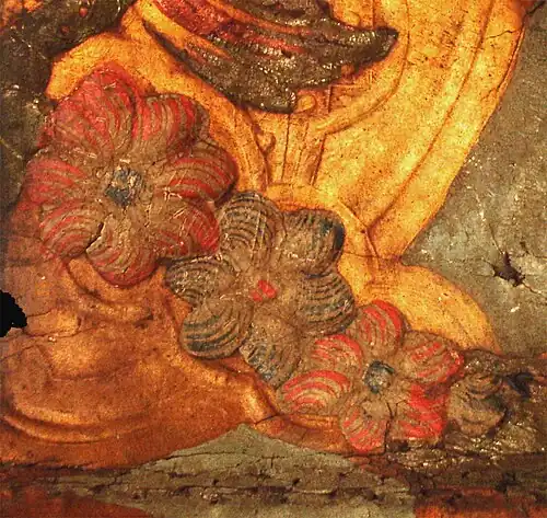Après toutes ces étapes, la peau était humidifiée et placée sous une presse avec une planche de bois gravée de motifs, qui était encrée avec du sandaraque et du noir de fumée. Ensuite, le motif était complété par des peintures à l’huile (qui ne sont pas à confondre avec le procédé de l'huile siccative).