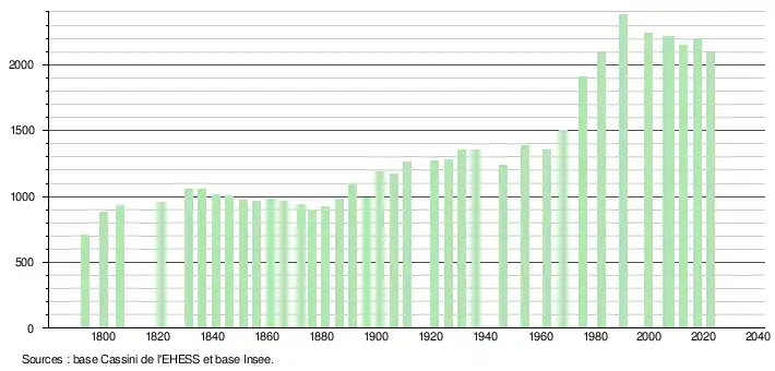 L'évolution du nombre d'habitants est connue à travers les recensements de la population effectués dans la commune depuis 1793. Pour les communes de moins de 10 000 habitants, une enquête de recensement portant sur toute la population est réalisée tous les cinq ans, les populations de référence des années intermédiaires étant quant à elles estimées par interpolation ou extrapolation[32]. Pour la commune, le premier recensement exhaustif entrant dans le cadre du nouveau dispositif a été réalisé en 2007[33].