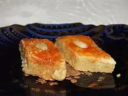 | Samani halva | La Samva Halva est fabriquée à partir de blé malté et peut, être, mieux décrite comme une épicée, goose et chétive. Une tradition halva samani en Azerbaïdjan est de faire de la halva en commun, en utilisant de la farine de sept maisons[4]. |