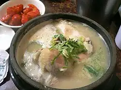- Samgyetang (삼계탕/蔘鷄湯, « soupe de poulet au ginseng ») : petit coquelet, farci avec du riz dans lequel on a mis une châtaigne, un jujube et quelques petites racines de ginseng, que l'on fait cuire dans un pot en terre contenant un bouillon (un peu comme la poule au pot mise à la mode par le roi Henri IV).
