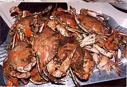 - Bull roast : c'est une spécialité d'été du Maryland pour les fêtes avec un grand nombre de personnes. Cette tradition remonte à la fin du XVIIe siècle en Angleterre[14]. Tout d'abord, une grande fosse est creusée dans le sol et remplie de bois de pommier, puis le feu est allumé. Quand il y a suffisamment de braises, on y fait rôtir lentement à la broche pendant douze heures un taureau entier dont on a ôté la tête et les pattes et dont la chair a été frottée d'une grande quantité d'épices. Il est servi avec de la salade de pommes de terre et de la bière froide.