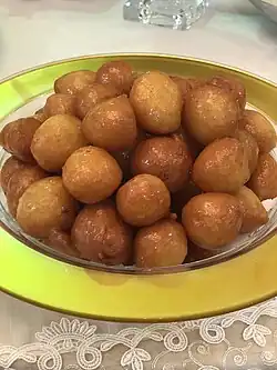 Le luqaimat est un dessert composé de boules de pâte levées et frites. Les ingrédients utilisés pour créer cette pâtisserie sucrée sont la farine, le lait, le beurre, le sucre, le safran et la cardamome. Après avoir été frits et prêts à être servis, du miel ou un sirop sucré est versé dessus[4].