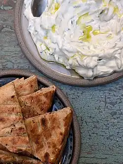 Salade grecque, composée principalement de tomate, de salade et de concombre, d'oignons rouges, de féta et d'olives de Kalamata servie avec de l'huile d'olive. À Chypre, elle contient du blé concassé (boulghour), des petits oignons et du jus de citron.