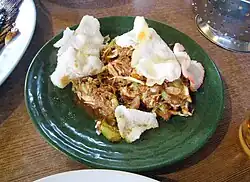 - Krupuk : galettes frites faites avec de la pâte de crevettes séchées.