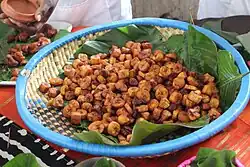 Alloco: petits dés ou lamelles de banane plantain mûre frits à l’huile, souvent consommé avec du poisson ou de l’œuf