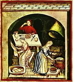 Des fours à bois existaient mais ils étaient très coûteux à construire et ils n'étaient utilisés que dans les grands châteaux et dans les boulangeries. Il était courant pour une commune d'avoir la propriété partagée d'un four banal, pour s'assurer que la cuisson du pain soit une affaire commune, plutôt que privée. Il existait également des fours portables destinés à être remplis de nourriture, puis ensevelis sous les charbons ardents ; certains étaient même installés sur des chariots, et permettaient de vendre des tourtes dans les rues des villes médiévales. Les cuisines de châteaux disposaient également de fours à potages[46]. La cuisson directe au feu de cheminée (cuisson dans l'âtre ou sur les braises) reste cependant prédominante jusqu'au XVIIIe siècle qui voit le développement des poêles. La cuisson s'effectuait généralement dans de simples pots et marmites, car c'était le moyen le plus efficace d'utiliser le bois de chauffage, et cela permettait d'éviter la perte des précieux jus de cuisson. Par conséquent, les plats les plus courants étaient les ragoûts et les potages[47]. Dans l'ensemble, la plupart des preuves montrent que les plats médiévaux avaient une assez forte teneur en graisse, du moins quand celle-ci était disponible. Cela n'était pas considéré comme un problème à une époque où le travail était éprouvant, les famines régulières et où l'embonpoint était synonyme de richesse ; seuls les pauvres, les malades et les ascètes étaient minces[48].