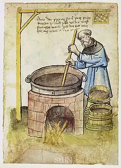 Aujourd'hui, l'eau est couramment consommée lors des repas mais, au Moyen Âge, les inquiétudes sur sa pureté, les recommandations médicales et son manque de prestige faisaient qu'on lui préférait souvent des boissons alcoolisées[note 12]. On considérait que ces boissons étaient plus nourrissantes et plus bénéfiques à la digestion et avaient l'avantage inestimable de réduire les risques de contamination grâce à l'alcool. Le vin était consommé tous les jours dans la plus grande partie de la France et dans tout l'ouest du bassin méditerranéen, où la vigne était cultivée. Plus au nord, il restait la boisson privilégiée de la bourgeoisie et de la noblesse qui pouvaient en acheter, mais les paysans et les ouvriers lui préféraient la bière et l'ale ou le cidre venu depuis l'Égypte par le Sud-Ouest de l'Europe.