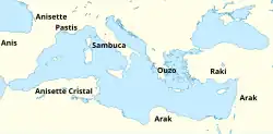 Les spiritueux à base d'anis sont consommés dans de nombreux pays du pourtour méditerranéen (anisette, pastis, patxaran, rakı, ouzo, tsípouro, sambuca, arak, etc).