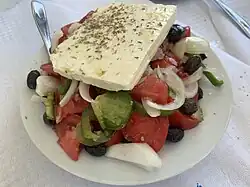 La cuisine grecque descend de la cuisine de la Grèce antique et a également été influencée par les cuisines romaine, byzantine et ottomane. Elle présente des similarités avec les cuisines turque, chypriote et italienne[99],[100]. Elle fait largement appel aux légumes, à l'huile d'olive, aux céréales, au poisson, au vin et à la viande, notamment l'agneau, la volaille, le lapin et le porc. D'autres ingrédients importants comprennent les olives, le fromage (feta, kasséri, kefalotýri, etc), l'aubergine, la courgette, la tomate, le concombre, le jus de citron, les herbes aromatiques (origan, menthe, oignon, ail, aneth, cumin et laurier, etc), le miel, le pain et le yaourt. Cette cuisine dispose d'un certain nombre d'entrées froides : salade grecque ou crétoise, tarama, tzatzíki, dolmadakia, poulpe grillé servi froid, etc. Elle propose aussi des plats chauds à base de viande ou de poisson comme la moussaka, le pastítsio, le gyros, la keftedakia, le kokoretsi, le souvláki, le savoro, On trouve également des plats à base de pâte phyllo salés comme la spanakópita ou sucrés comme la baklava ou le bougatsa[101],[102].