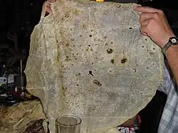 Un autre plat festif notable est le tamal. Il s'agit d'une portion de semoule de maïs farcie, cuite à la vapeur. C'est l'un des aliments de base dans de nombreuses régions du Mexique et même de l'Amérique Latine. Ses origines remontent à l'ère préhispanique et on en trouve de nombreuses variétés dans tout le Mexique. Comme le mole, il est compliqué à préparer et propice à une préparation en grande quantité[27]. Les tamales sont associés à certaines célébrations, par exemple la Chandeleur[28]. Ils sont enveloppés dans une enveloppe de maïs dans les régions montagneuses et désertiques du Mexique et dans des feuilles de bananes dans les régions tropicales[29].