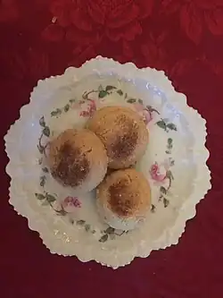 - Confiserie, pâtisseries, glaces : baklava, beignets sucrés, boule de Moscou, bradges[16], bûche de Noël, cheveux d'ange, cigare aux amandes, Knédlette ou knidlate (corbeille aux amandes, Algérie), cornes de gazelles, confiture (orange, orange amère, coings, figue, nèfle, pastèque, raisin, datte), couronnes à l'anis, couscous sucré aux raisins secs, crêpes, créponné, dattes fourrées à la pâte d'amande, délices d'Alger, doigts de la mariée, flan à l'orange, Sfendj (beignet), ftaïr (beignet tunisien), galettes sucrées, gâteau napolitain, gelée d'arbouses ou de coings, glace italienne, halva (aux amandes, à la vanille, à la pistache, ou au chocolat), rahat-lokoum ou loukoum, makroud au miel, mandarines confites, montecaos, mouna (brioche pour Pâques à l'huile d'olive ou au beurre et à la fleur d'oranger ; se mange aussi au petit déjeuner. Jusqu'à l'arrivée dans les foyers des premières cuisinières, la pâte était apportée au four du boulanger qui la cuisait)[28], nougat turon, oreillettes (merveilles), oublies, pain perdu, pâte de fruits, riz au lait à la pistache, roïcos[29], patates douces frites et sucrées, pruneaux fourrés à la pâte d'amande, salade d'oranges, sorbets, tartes, zlabia (oranaise, algéroise, tunisienne).