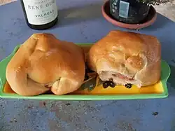 La fougasse est un pain provençal. Le nom trouve son origine dans le latin panis focacius, un pain plat cuit sur un foyer ou sous les cendres d'un feu. Elle ressemble à la pizza[15], bien qu'elle n'ait aucun lien historique connu avec cette dernière. Elle est assez plate, souvent sculptée à la préparation, pour former plusieurs branches. Il existe une extrême diversité des fougasses, chaque région provençale, ville ou même chaque famille ayant sa propre recette. La plupart des fougasses sont salées, elles peuvent être agrémentées de divers ingrédients (olives, lardons, anchois, fromages), qui peuvent être soit mélangés à la préparation, soit déposés à la surface du pain avant cuisson. Mais on trouve aussi la fougasse d'Aigues-Mortes, qui est sucrée, et la fougassette de Grasse, qui est légèrement briochée et aromatisée à la fleur d'oranger.