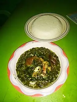 Pinon + Gboma déssi - Djongoli: purée de haricots à l’huile de palme et à la farine de maïs; présente aussi dans la cuisine béninoise
