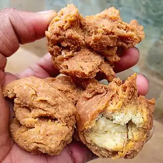 Agbéli kanklo + noix de coco - Gâteau de poisson: fait avec une pâte croquante après cuisson à l'aspect, une variante locale de pastel[7]