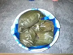 Akpan - Egblin: boule à base de crème de maïs très fermenté; enveloppée dans des feuilles de manioc, elle est cuite à la vapeur.