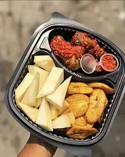 Eteh-ba - Koliko: frites d'igname accompagnées de sauce piment, diverses viandes au choix, volailles, brochettes, poisson, sardines.