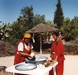 On utilisait souvent le tamis (ghorbal) et la peau de mouton retournée, pour tamiser céréales moulues et épices, alors que le pilon (mehrass) permettait de réduire notamment l'ail et les épices en pâte.