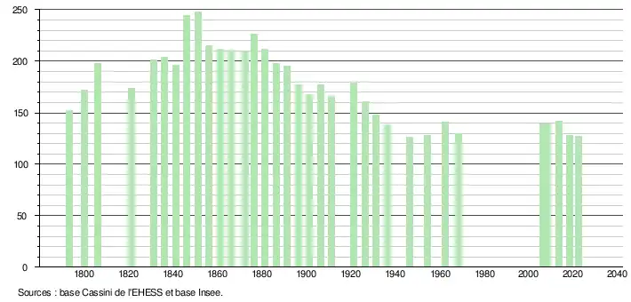 L'évolution du nombre d'habitants est connue à travers les recensements de la population effectués dans la commune depuis 1793. Pour les communes de moins de 10 000 habitants, une enquête de recensement portant sur toute la population est réalisée tous les cinq ans, les populations de référence des années intermédiaires étant quant à elles estimées par interpolation ou extrapolation[36]. Pour la commune, le premier recensement exhaustif entrant dans le cadre du nouveau dispositif a été réalisé en 2008[37].