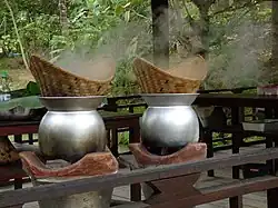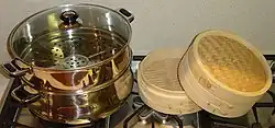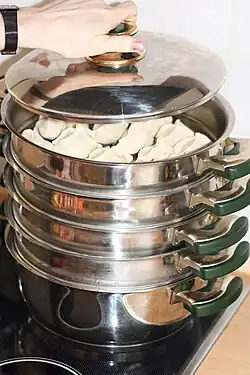 - Le cuiseur vapeur également appelé cuit-vapeur est un appareil ménager dédié, souvent à plusieurs plateaux[55], certains cuiseurs à riz en sont également équipés[56].