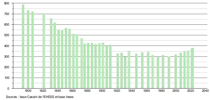 L'évolution du nombre d'habitants est connue à travers les recensements de la population effectués dans la commune depuis 1793. Pour les communes de moins de 10 000 habitants, une enquête de recensement portant sur toute la population est réalisée tous les cinq ans, les populations de référence des années intermédiaires étant quant à elles estimées par interpolation ou extrapolation[25]. Pour la commune, le premier recensement exhaustif entrant dans le cadre du nouveau dispositif a été réalisé en 2006[26].