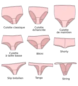 Lorsque sa partie arrière n'est constituée que d'une fine bande de tissu passant entre les fesses, elle est aussi appelée string. En France, « slip » désigne couramment ce sous-vêtement, plus généralement pour les hommes que pour les femmes, pour lesquelles le terme « culotte » reste plus répandu.