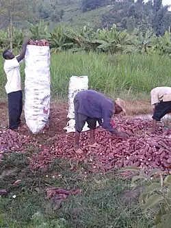 Selon les systèmes de culture, la récolte peut être manuelle, semi-mécanisée ou totalement mécanisée. La récolte manuelle est la plus répandue dans l'aire de culture de la patate douce, notamment dans les diverses communautés des régions tropicales d'Afrique et d'Asie. Elle autorise la récolte échelonnée en fonction des besoins, ce qui élude en partie le problème de la conservation et limite les attaques des charançons[5].