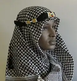 Cette pièce de tissu servait originellement à masquer le visage pour se protéger du soleil et des tempêtes de sable. Il existe différents motifs et différentes couleurs qui varient du jaune au noir en passant par le rouge, le blanc et le vert.